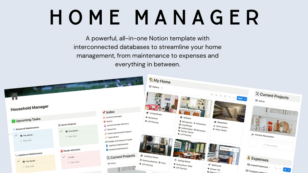 Streamline your household organization with the Household Manager Notion Template—a powerful, all-in-one solution designed to help you stay on top of every aspect of your home. With interconnected databases, this template ensures all your information is seamlessly updated and accessible in one place, so you can focus on what matters most.