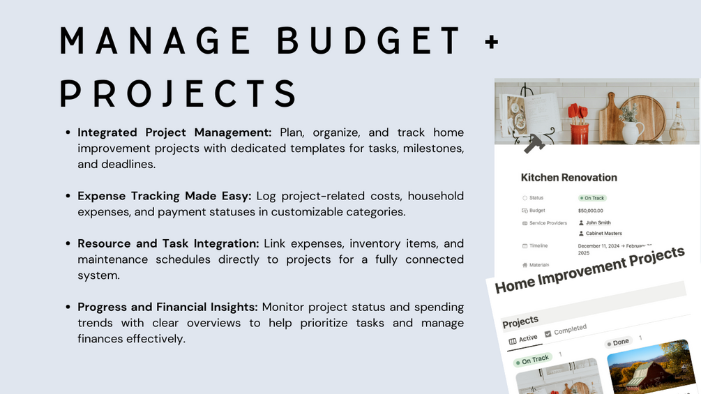 • Project Planning: Organize home improvement projects with intuitive templates that make planning and tracking progress easy.