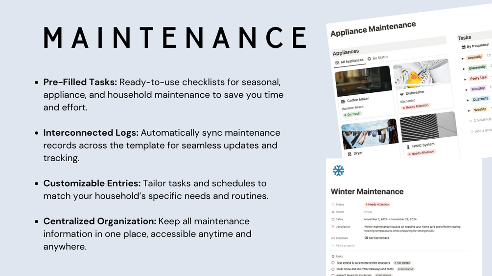 • Appliance Maintenance Logs: Track repairs, servicing, and upkeep with detailed logs that update across the template.