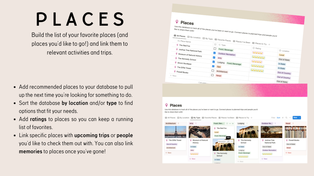 - Place Database: Compile recommended spots to visit, sortable by location and type. Rate places to maintain a list of favorites, and associate specific locations with trips or companions.