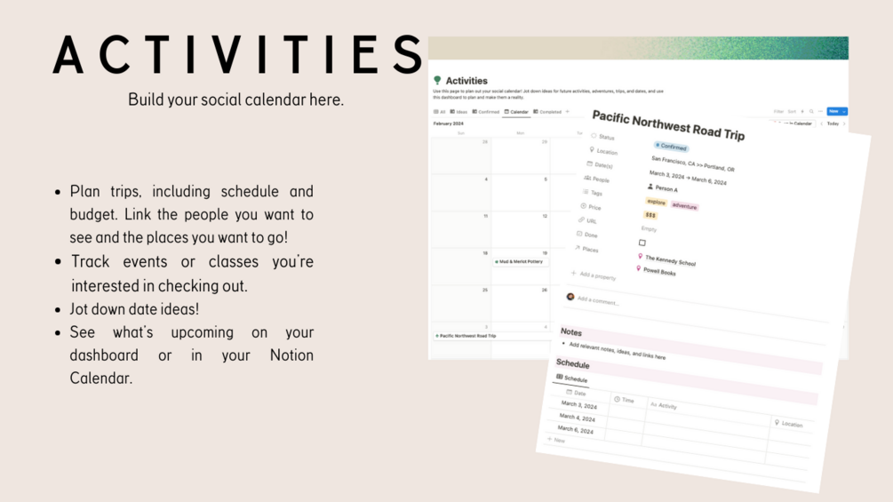 - Activity Planning: Organize trips with schedules and budgets, linking the people you want to see and places you want to go. Track events or classes of interest, jot down date ideas, and view upcoming activities on your dashboard or Notion calendar.