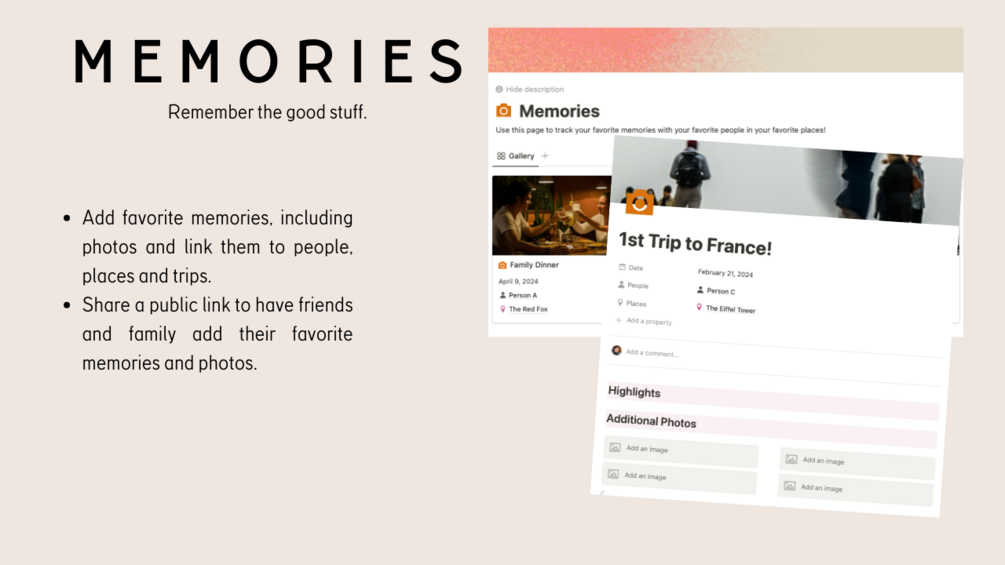 - Memory Gallery: Preserve cherished memories with photos, linking them to people, places, and trips. Share a public link to invite friends and family to contribute their favorite memories and photos.