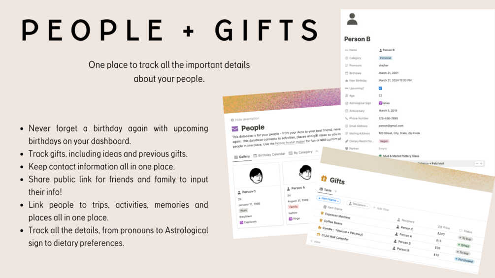 - People Management: Never miss a birthday with upcoming reminders on your dashboard. Track gift ideas and past presents, maintain contact information in one place, and link individuals to trips, activities, memories, and places. Capture details like pronouns, astrological signs, and dietary preferences.