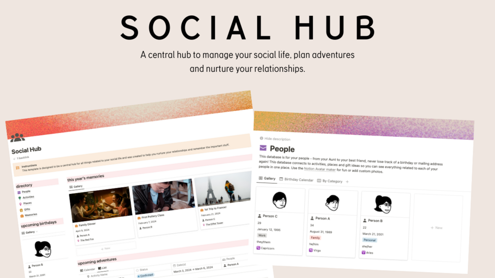 Introducing the Social Hub / Personal CRM Notion Template—a comprehensive solution to organize and enhance your social life. This template serves as a central hub, helping you remember important details, have more fun, and nurture your relationships.
